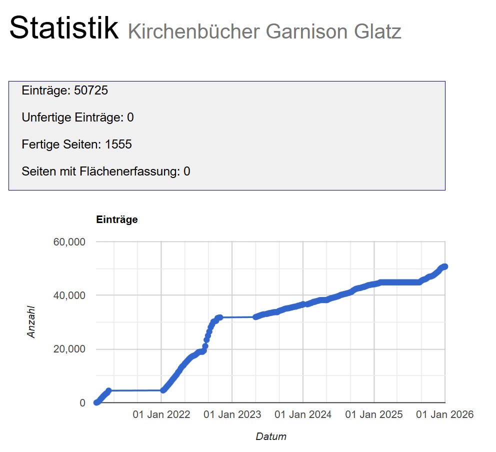 Bei der seit Januar 2021 laufenden Transkription der Militärkirchenbücher der Festung Glatz wurde ein neuer Meilenstein erreicht. Mittlerweile konnten 50.000 Datensätze von Militärpersonen, ihren Angehörigen, Taufpaten und Trauzeugen mit dem DES (Daten-Eingabe-System) des Vereins für Computergenealogie erfasst und der Allgemeinheit zur Verfügung gestellt werden. Die Informationen über tausende Personen stellen einen wertvollen Datenschatz für die wissenschaftliche und familiengeschichtliche Forschung dar.