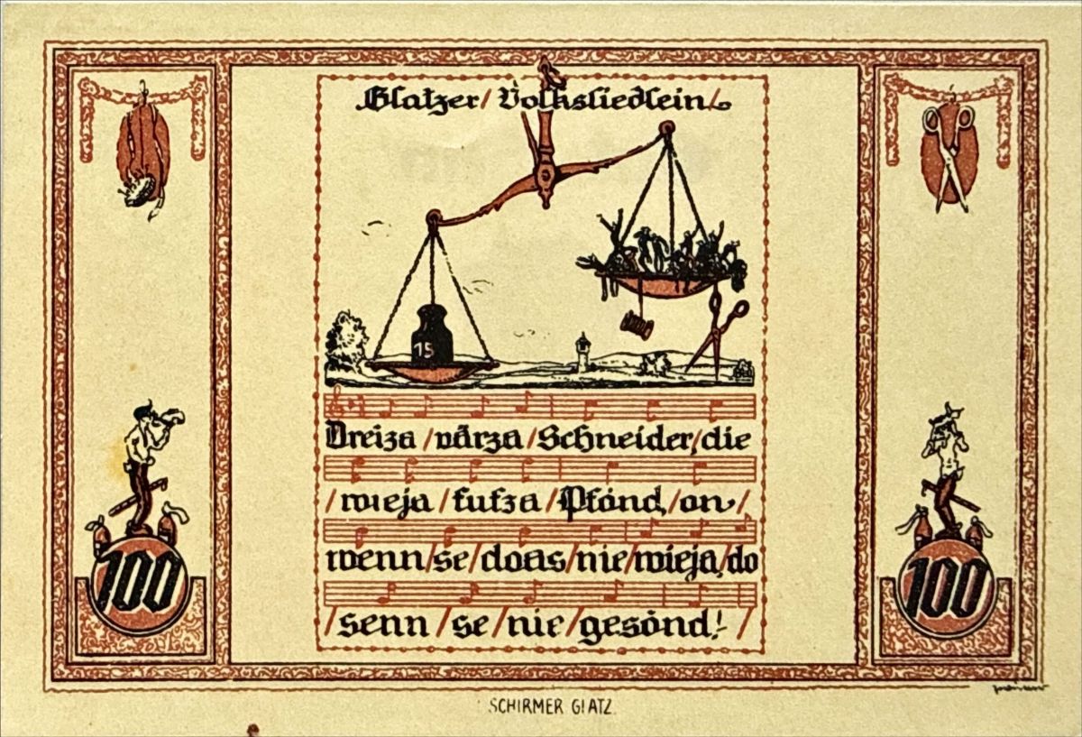 Auf der Rückseite ist jeweils ein „Glatzer Volksliedlein“ in Mundart mit Noten und passenden Motiven abgebildet.