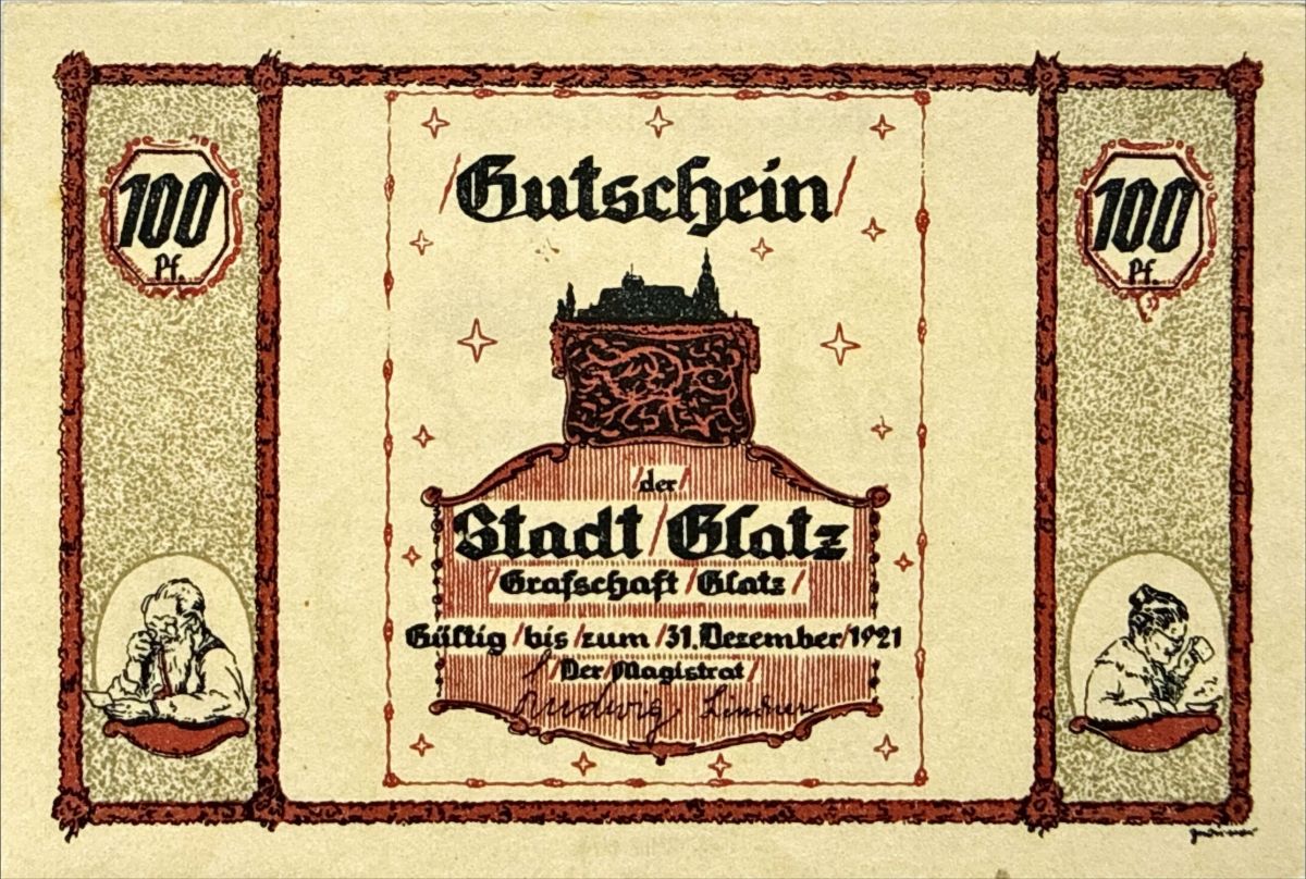 Der oben gezeigte Glatzer Notgeldschein ist Teil einer Serie von 4 Scheinen mit unterschiedlicher Färbung und den Werten von 25 (blau und schwarz), 50 (grün und schwarz), 75 (gelb und schwarz) und 100 Pfennig (rot und schwarz).