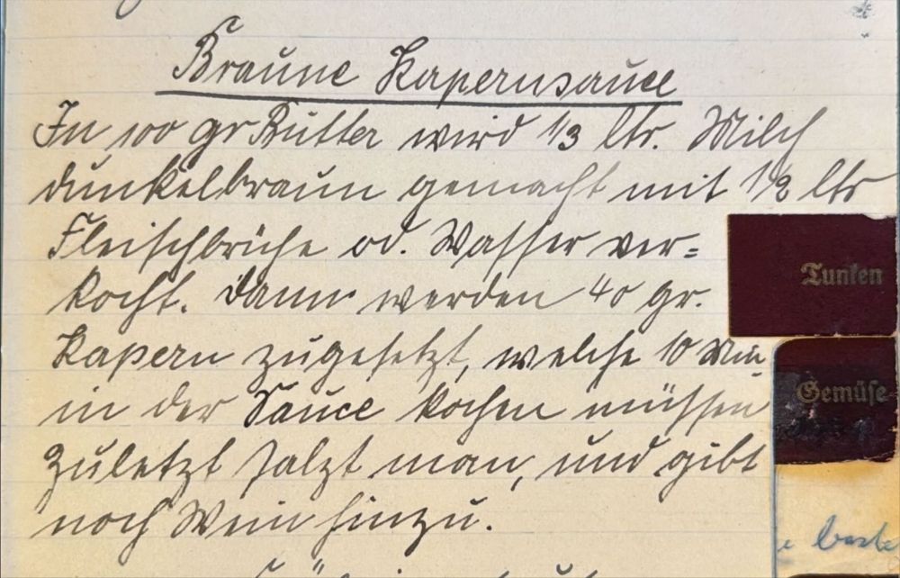 Rezept für Braune Kapernsauce. Rezeptbuch von Elfriede Vogt geb. Zickler aus Aplerbeck, ca. 1930.