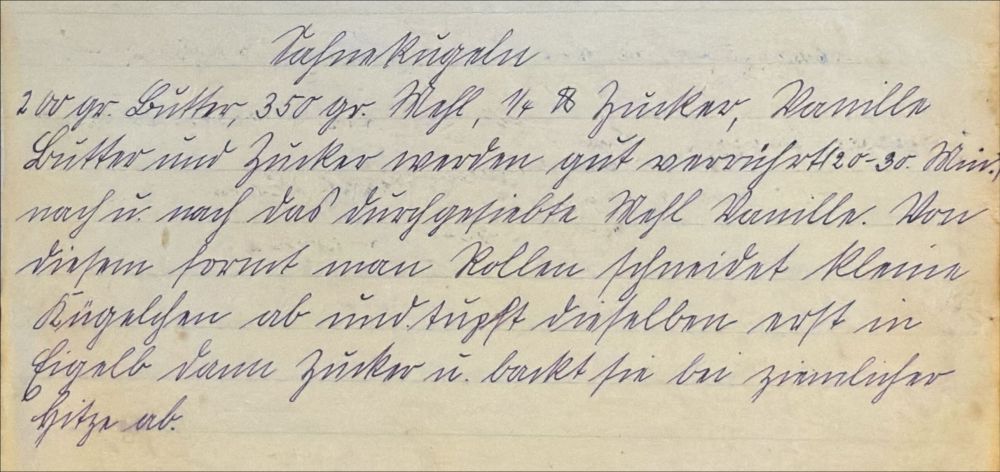 Rezept für Sahnekugeln. Rezeptbuch von Elfriede Vogt geb. Zickler aus Aplerbeck, ca. 1930.