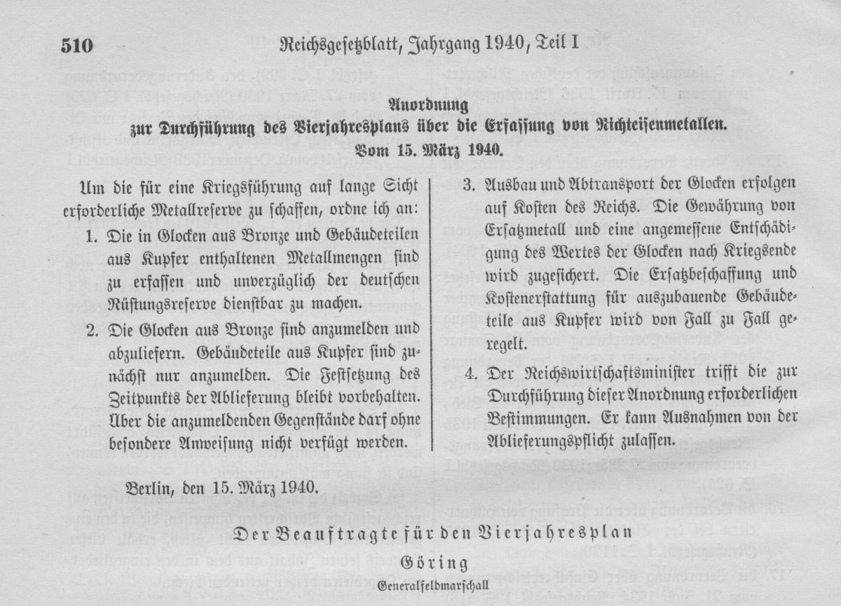 Aus deutschen Kirchen wurden 90.000 Glocken eingeschmolzen, aus den besetzten Gebieten 60.000.